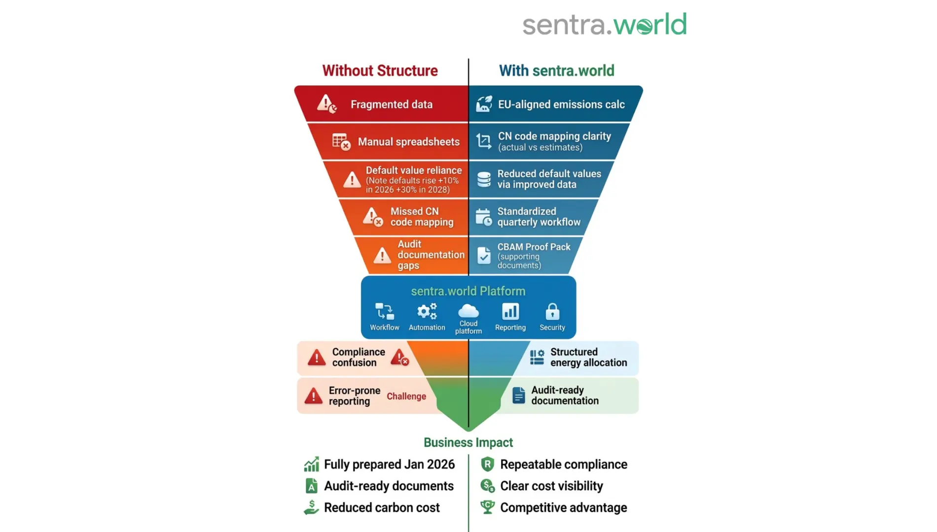 With sentra.world’s digital platform and advisory expertise, Berry Alloys transformed CBAM reporting from a compliance risk that comes quarterly into a strategic competitive capability.